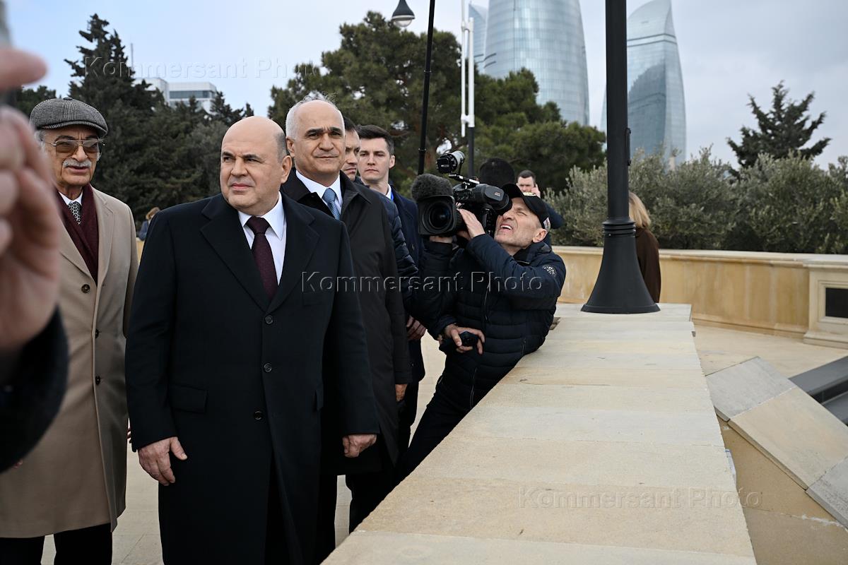 Рабочая поездка председателя правительства России Михаила Мишустина в Баку. Церемония возложения венка и цветов к могиле Гейдара Алиева и его супруги Зарифы Алиевой на Аллее почетного захоронения. Председатель правительства России Михаил Мишустин (справа) во время церемонии.
