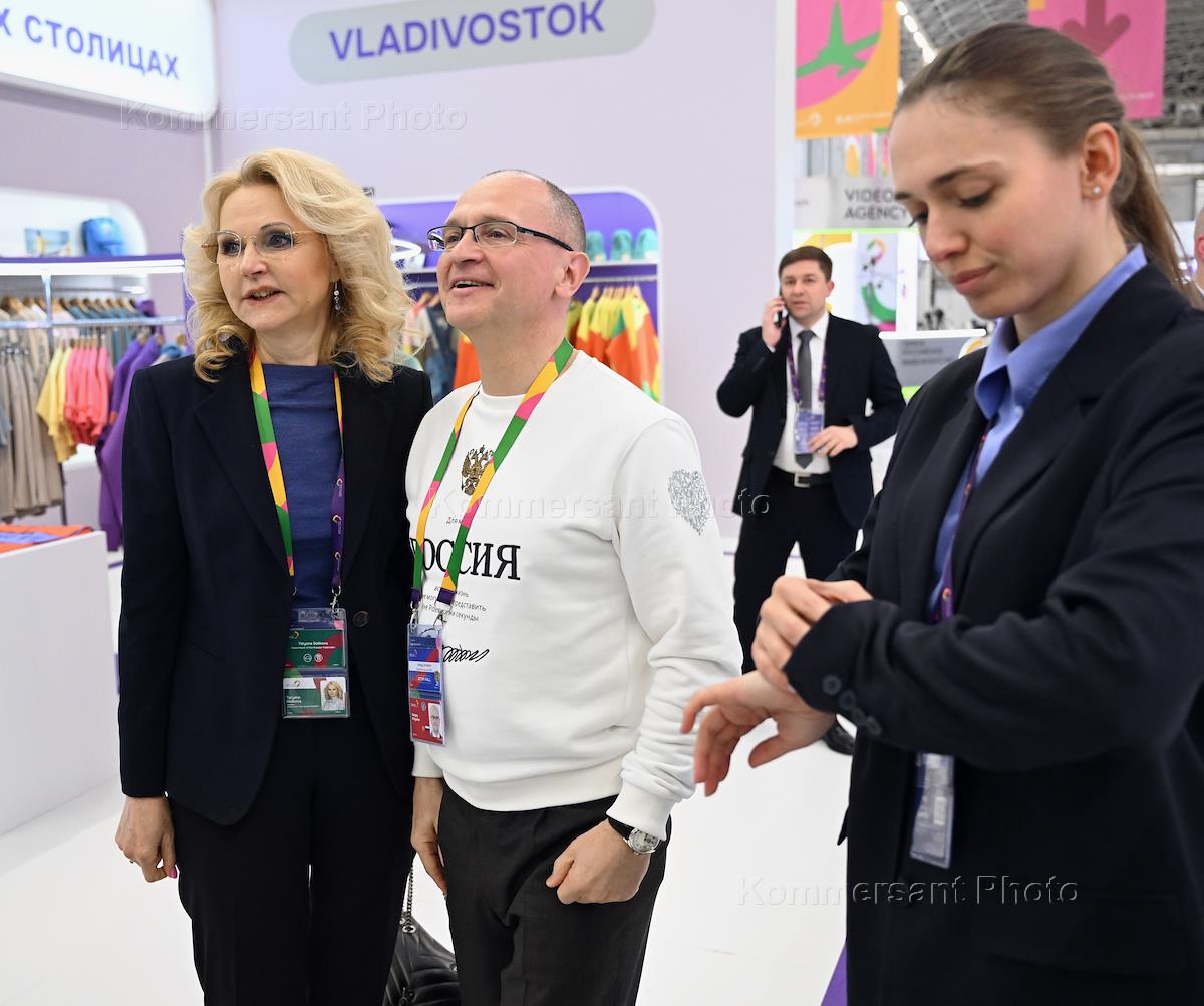 Working trip of Russian President Vladimir Putin to Sochi. Deputy Prime Minister of Russia Tatyana Golikova (left), head of the Federal Agency for Youth Affairs Ksenia Razuvaeva (right) and First Deputy Head of the Russian Presidential Administration Sergei Kiriyenko (center) before the closing ceremony of the World Youth Festival 2024 at the Sirius Federal Territory.