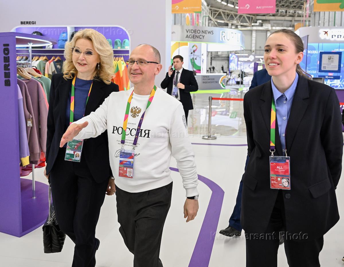 Working trip of Russian President Vladimir Putin to Sochi. Deputy Prime Minister of Russia Tatyana Golikova (left), head of the Federal Agency for Youth Affairs Ksenia Razuvaeva (right) and First Deputy Head of the Russian Presidential Administration Sergei Kiriyenko (center) before the closing ceremony of the World Youth Festival 2024 at the Sirius Federal Territory.
