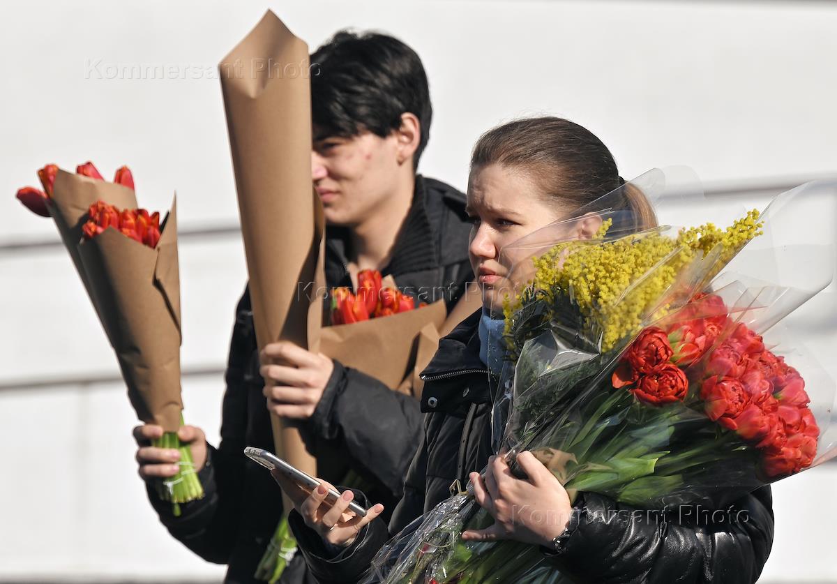 Celebrating International Women's Day on March 8 in the city. Genre photography. Man and woman with bouquets of flowers.
