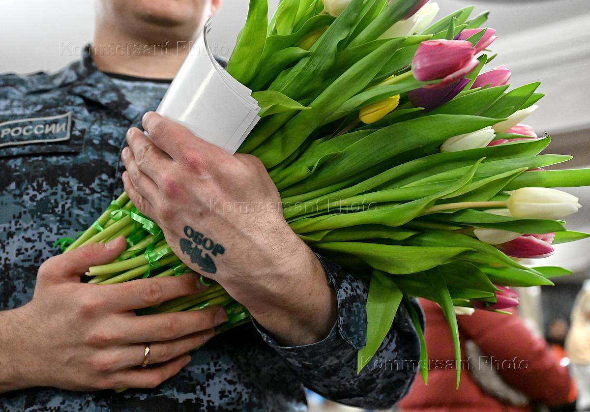 Celebrating International Women's Day at the Kurskaya metro station. Genre photography. A law enforcement officer with bouquets of flowers at a metro station.