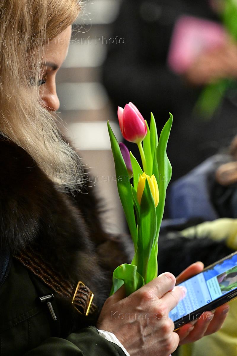 Празднование Международного женского дня на станции метро "Курская". Жанровая фотография. Девушка с букетом цветов фотографирует себя на камеру мобильного телефона на станции метрополитена.