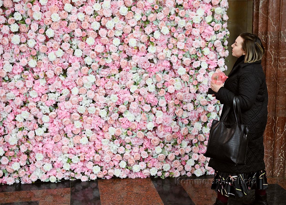 Празднование Международного женского дня на станции метро "Курская". Жанровая фотография. Фотозона, сделанная к празднику, на станции метрополитена.