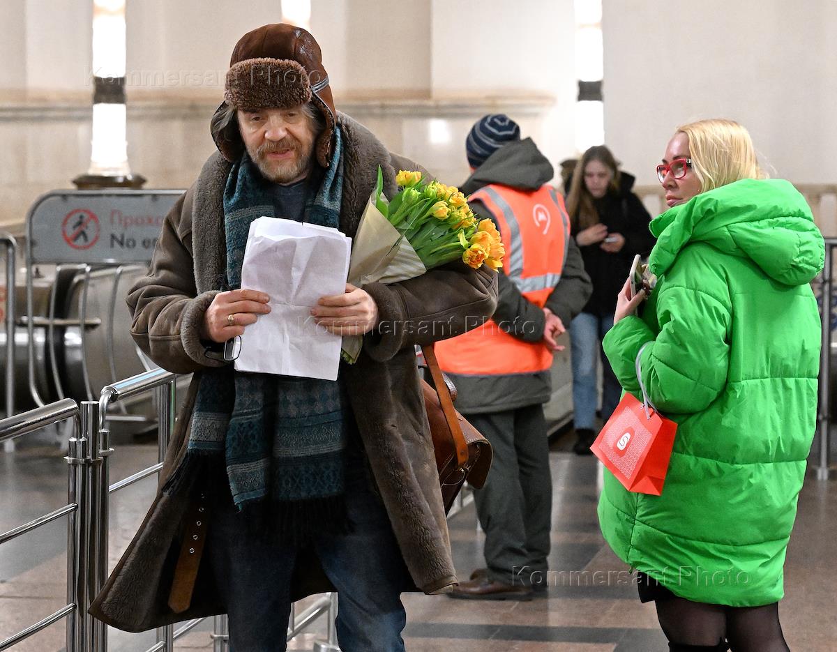 Жанровая фотография. Подготовка к празднованию Международного женского дня на станции метро "Курская". Пожилой мужчина с букетом цветов на станции метро.