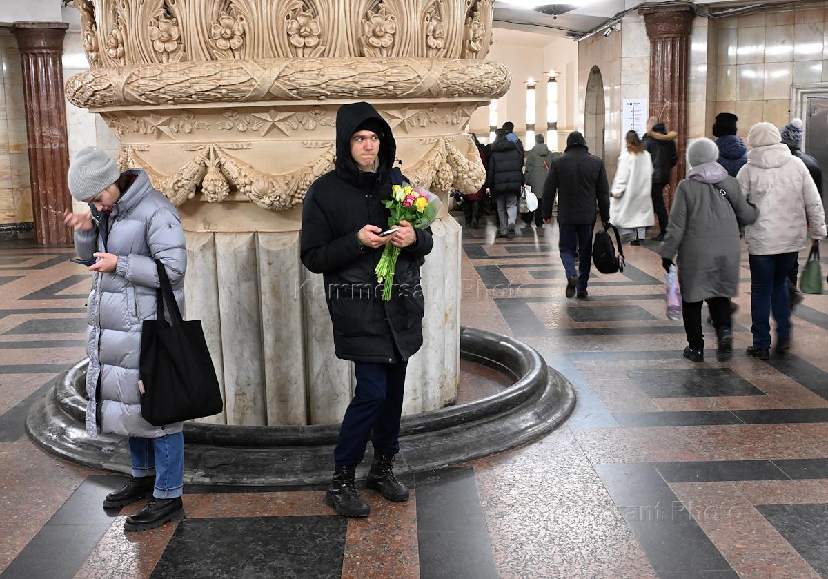 Genre photography. Preparations for the celebration of International Women's Day at the Kurskaya metro station. A man with a bouquet of flowers stands in the lobby of a metro station.