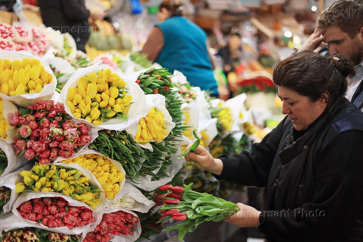 Подготовка к празднованию Международного женского дня. Жанровая фотография. Продажа цветов на Рижском рынке. Девушка продает тюльпаны оптом.