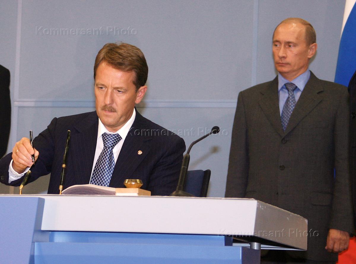 Russian Agriculture Minister Aleksey Gordeyev, left, and Russian President Vladimir Putin, right, attend agriculture cooperation between Russia and Hungary agreement signing in presidential residence Bocharov Ruchey in Sochi.