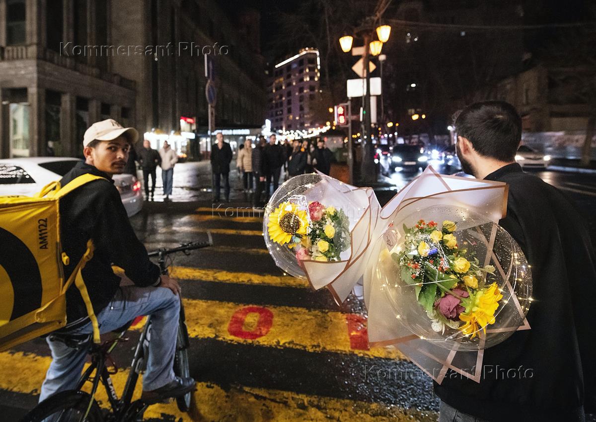Виды вечернего Еревана накануне Международного женского дня - 8 марта. Жанровая фотография. Уличная торговля цветами.