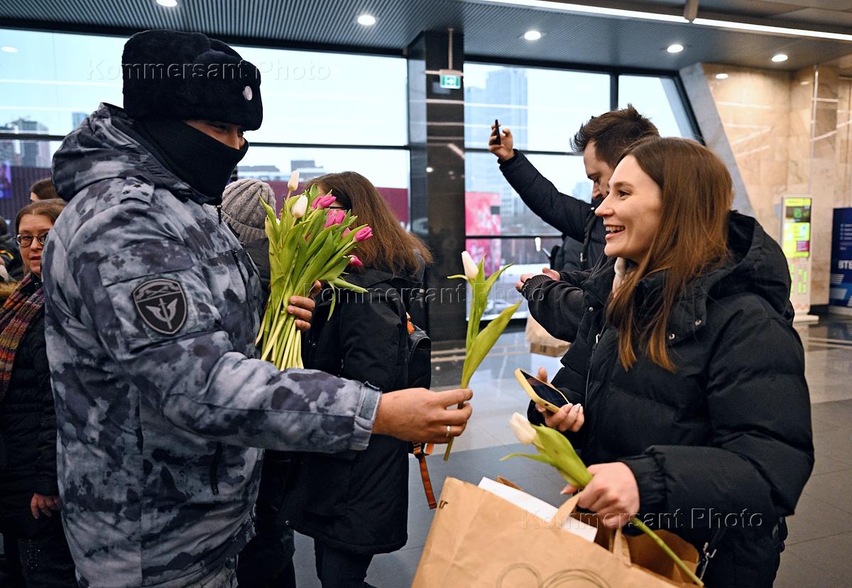 Celebrating International Women's Day at the Michurinsky Prospekt metro station on the Big Circle Line. Genre photographs. A riot police officer gives flowers to women.
