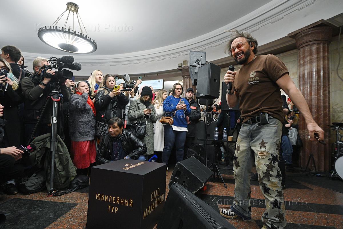 Празднование Международного женского дня - 8 марта на станции метро "Курская". Певец Стас Михайлов во время выступления в аванзале станции метро "Курская".
