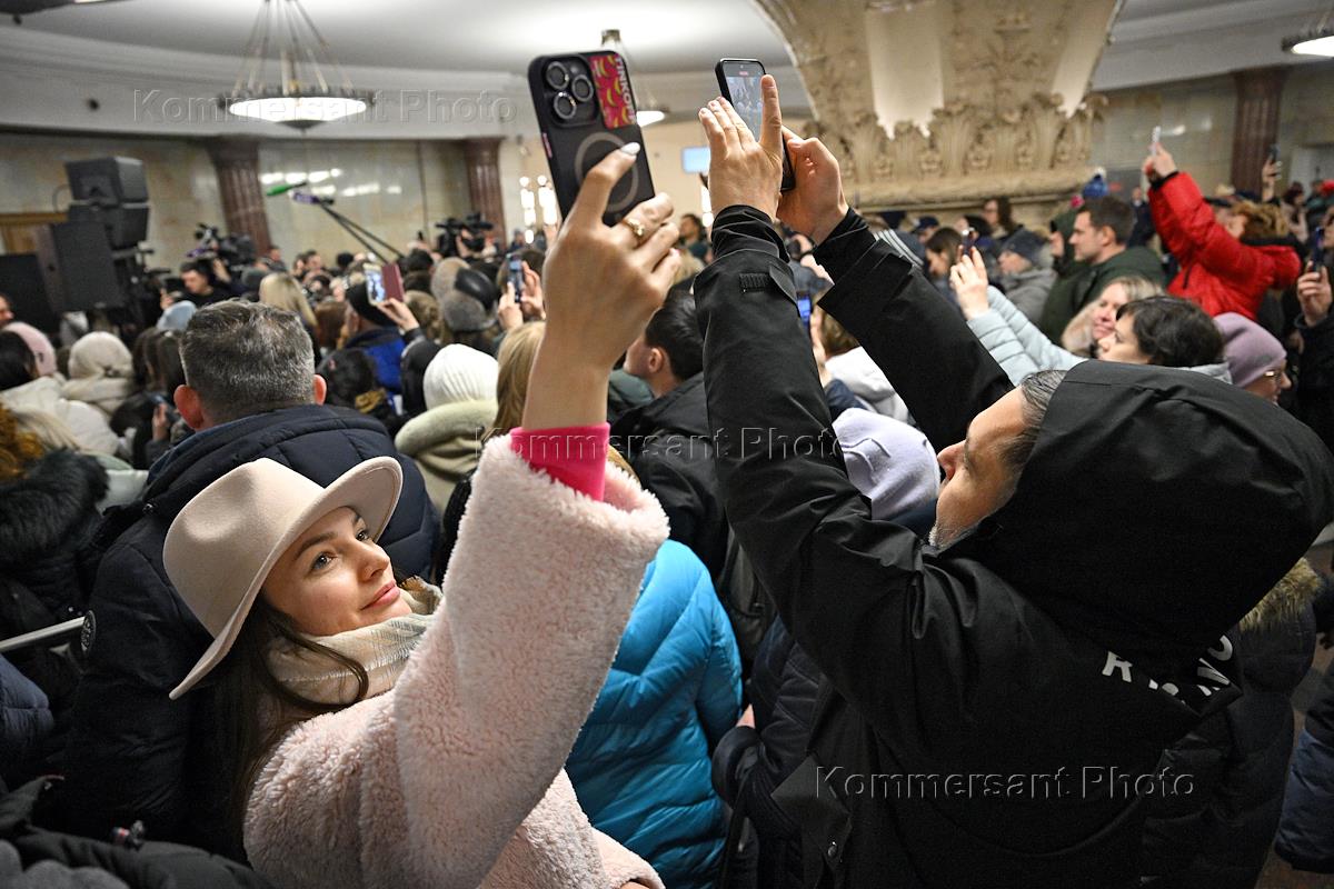 Празднование Международного женского дня - 8 марта на станции метро "Курская". Пассажиры во время концерта певца Стаса Михайлов в аванзале станции метро "Курская".