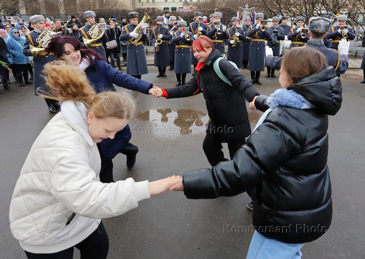 Action of the command of the Leningrad Military District in honor of International Women's Day - March 8 in St. Petersburg. Performance of a military orchestra on Senate Square.