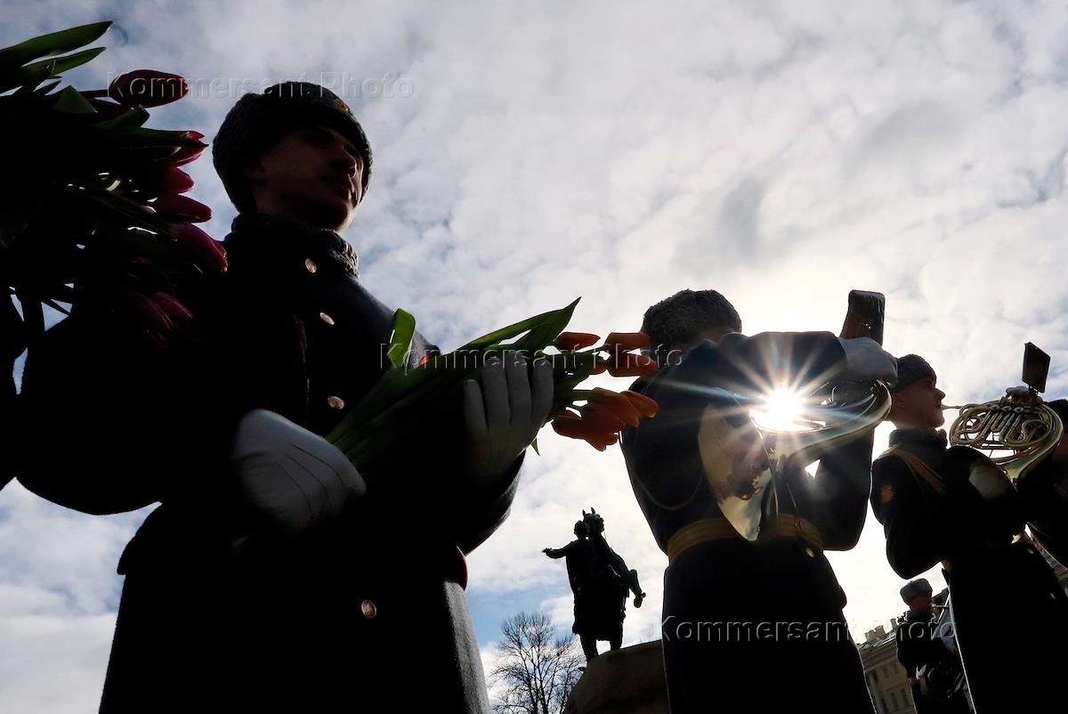 Action of the command of the Leningrad Military District in honor of International Women's Day - March 8 in St. Petersburg. Performance of a military orchestra on Senate Square.