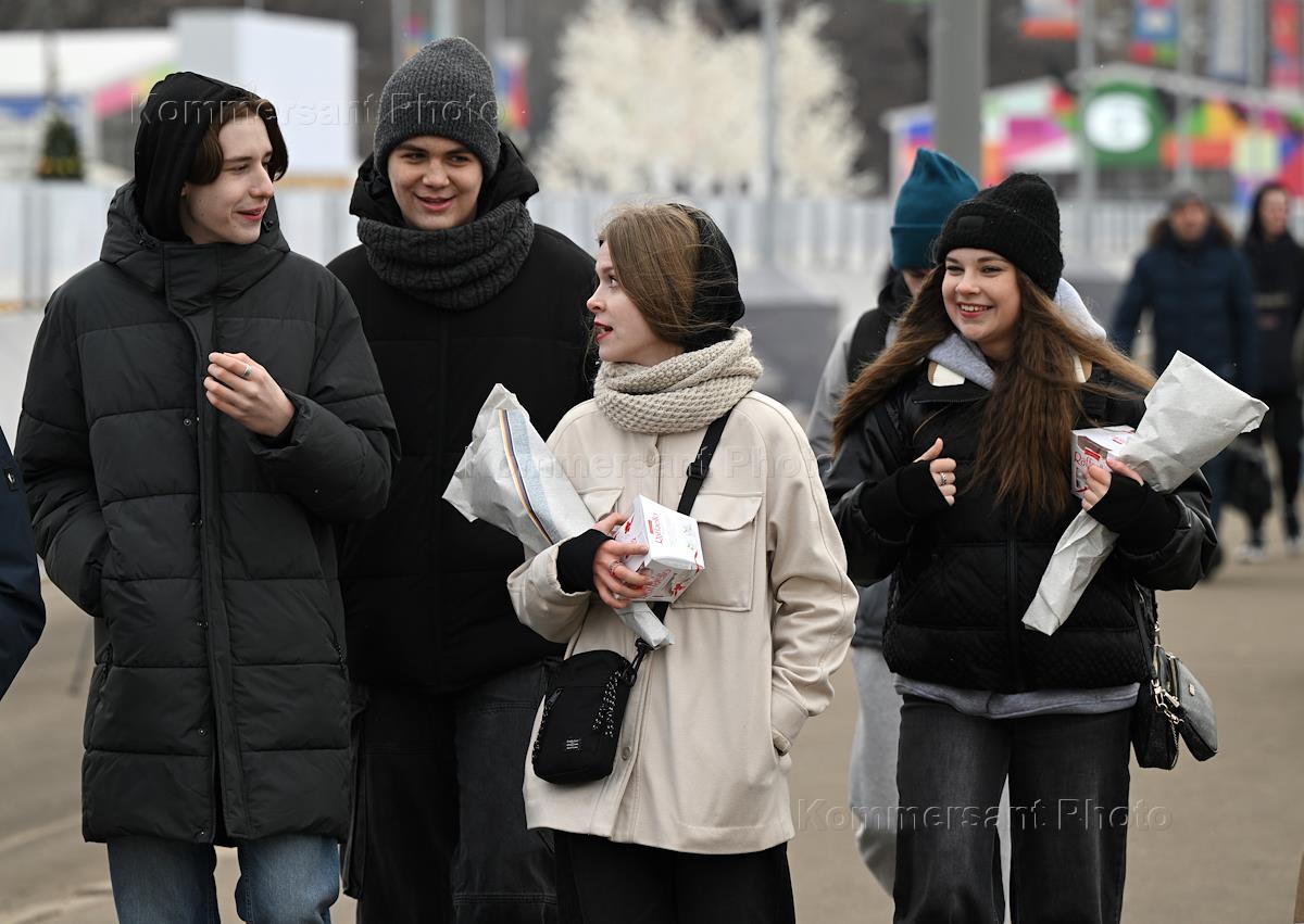 Views of Moscow during the celebration of International Women's Day - March 8. Vacationers in the Gorky Park. Genre photographs.