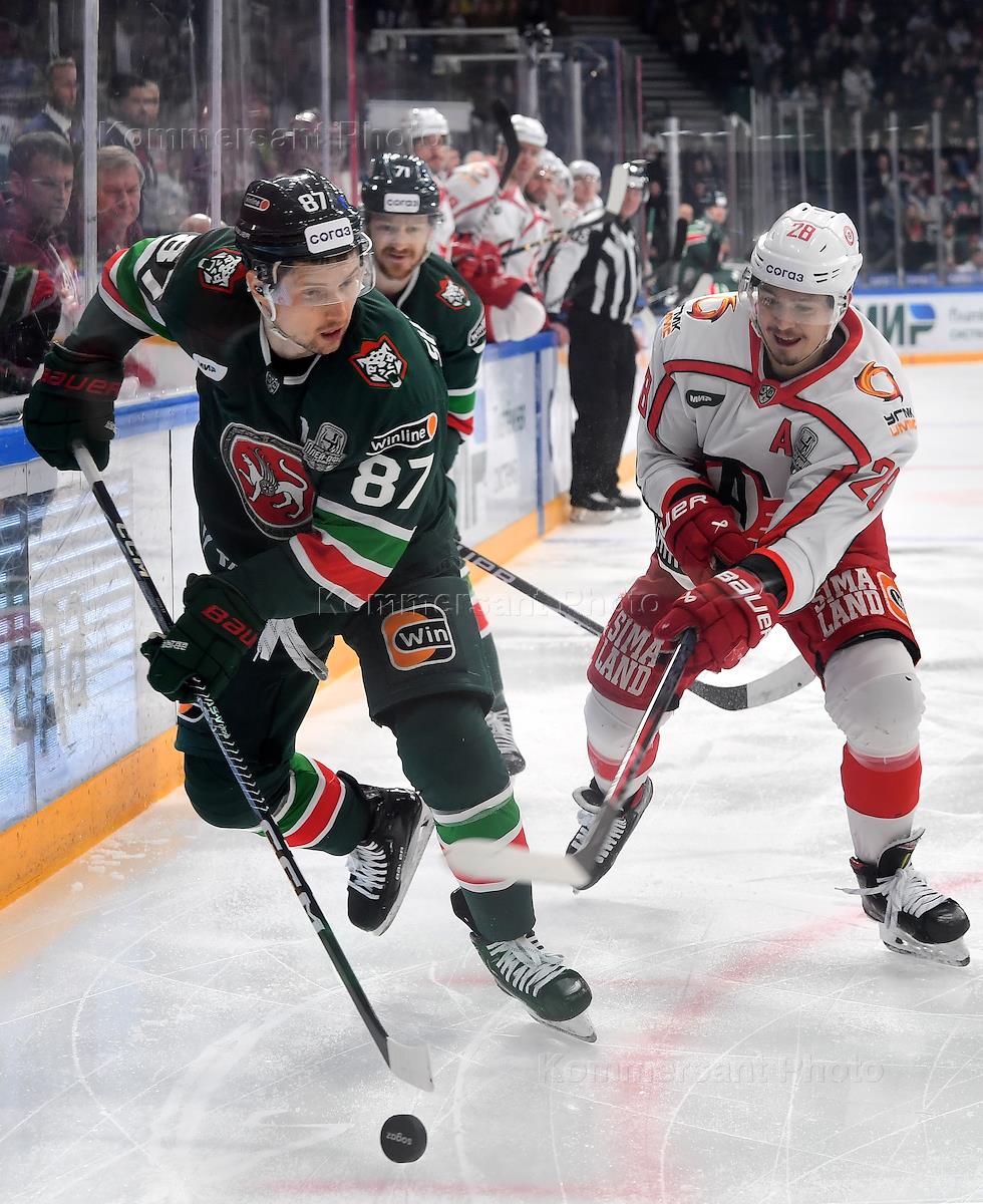 Kontinental Hockey League (KHL). Championship season 2023/24. Match between the teams "Ak Bars" (Kazan) - "Avtomobilist" (Ekaterinburg) at the Tatneft Arena stadium. Ak Bars team player Vadim Shipachev (left) and Avtomobilist team player Alexey Byvaltsev (right) during the match.