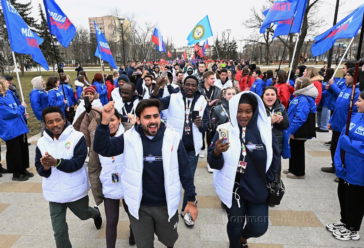 Старт регионального этапа Всемирного фестиваля молодежи (ВФМ)-2024 в Луганске. Шествие участников региональной программы ВФМ от Сквера имени героев "Молодой гвардии" до Луганского академического русского драматического театра имени Павла Луспекаева. жанровая фотография. Плакат к выборам президента России.