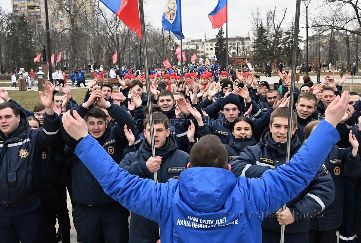 Старт регионального этапа Всемирного фестиваля молодежи (ВФМ)-2024 в Луганске. Участники региональной программы ВФМ перед началом шествия от Сквера имени героев "Молодой гвардии" до Луганского академического русского драматического театра имени Павла Луспекаева.
