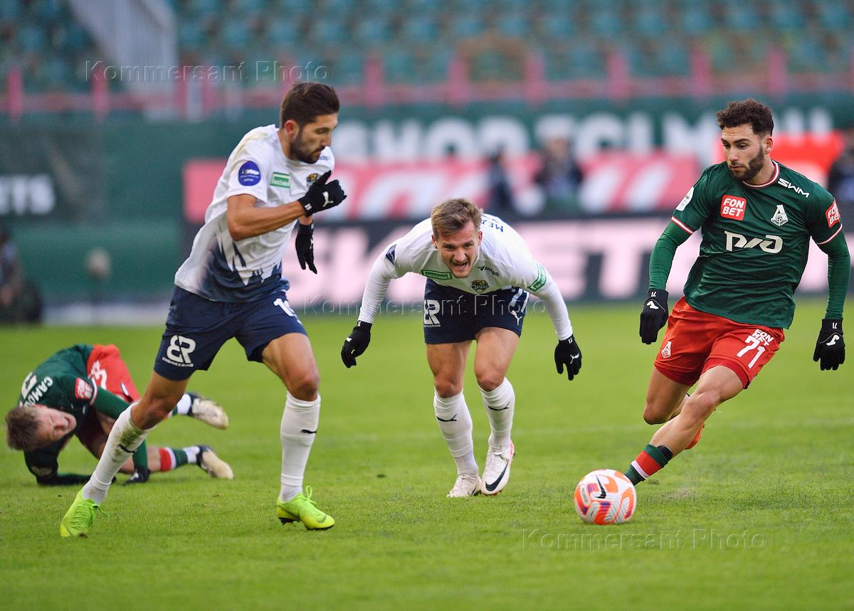 Russian Premier League (RPL). MIR - Russian Football Championship 2023/2024. 20th round. Match between the teams Lokomotiv (Moscow) - Sochi (Sochi) at the RZD Arena stadium. Sochi team player Lucas Fasson (left) and Lokomotiv team player Niar Tiknizyan (right) during the match.