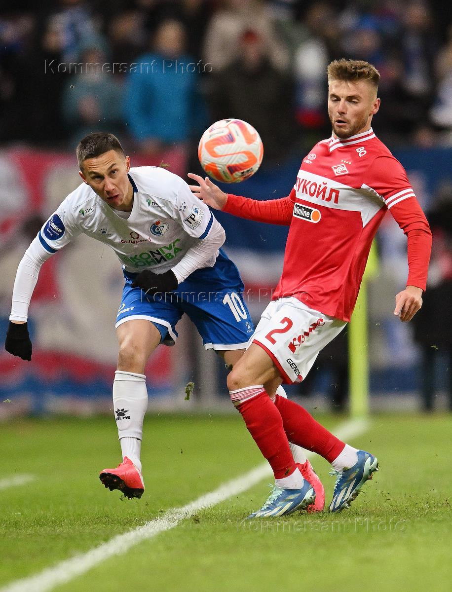 Russian Premier League (RPL). MIR - Russian Football Championship 2023/2024. 20th round. Match between the teams "Spartak" (Moscow) - "Fakel" (Voronezh) at the Luzhniki stadium. Spartak team player Anton Zinkovsky (left) during the match.
