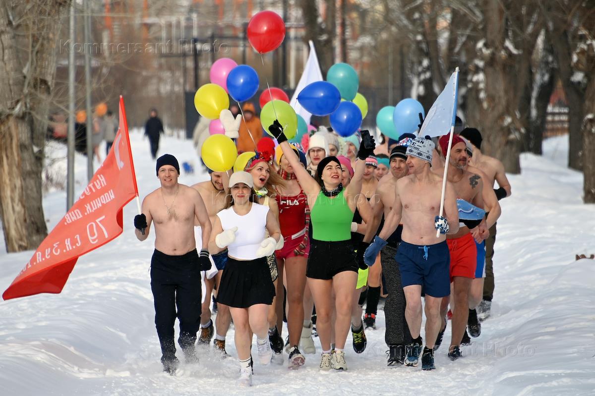 Празднование международного женского дня 8 Марта. Забег в купальниках в парке "Зеленый остров". Участники клуба закаливания и зимнего плавания "Моржи" во время забега.