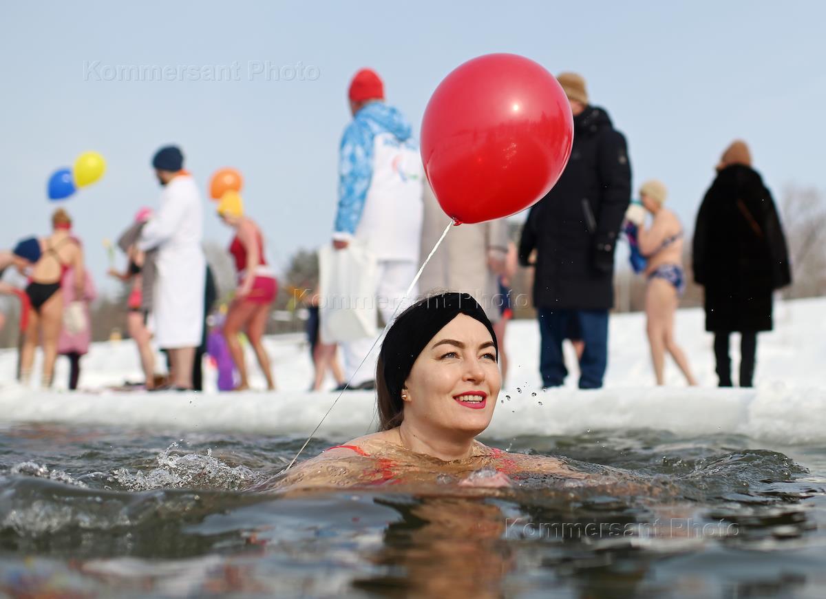 Празднование международного женского дня 8 Марта. Забег в купальниках в парке "Зеленый остров". Клуб закаливания и зимнего плавания "Моржи". Женщина во время заплыва в проруби.