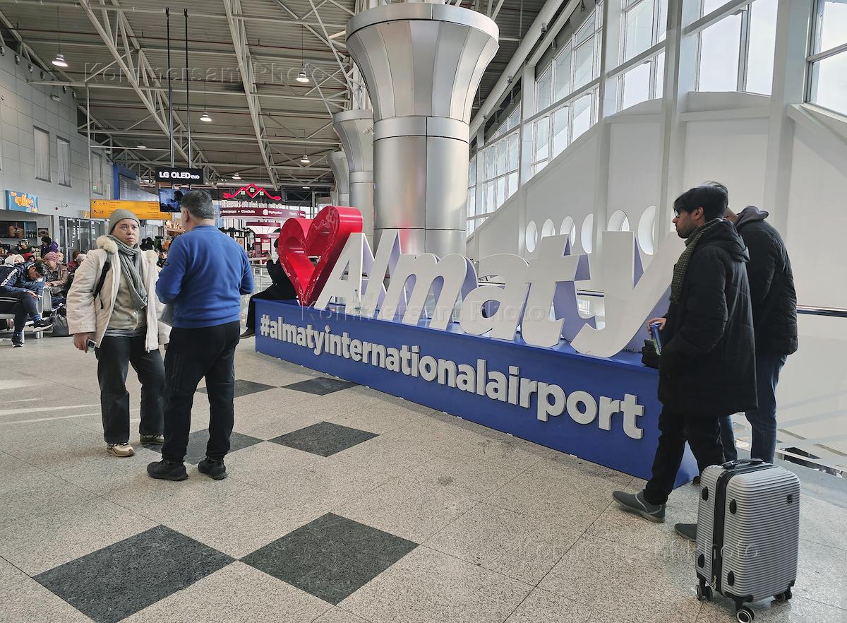 Виды Алма-Аты. Жанровая фотография. Пассажиры в здании международного аэропорта Алма-Аты у инсталляции с надписью "Алматы".