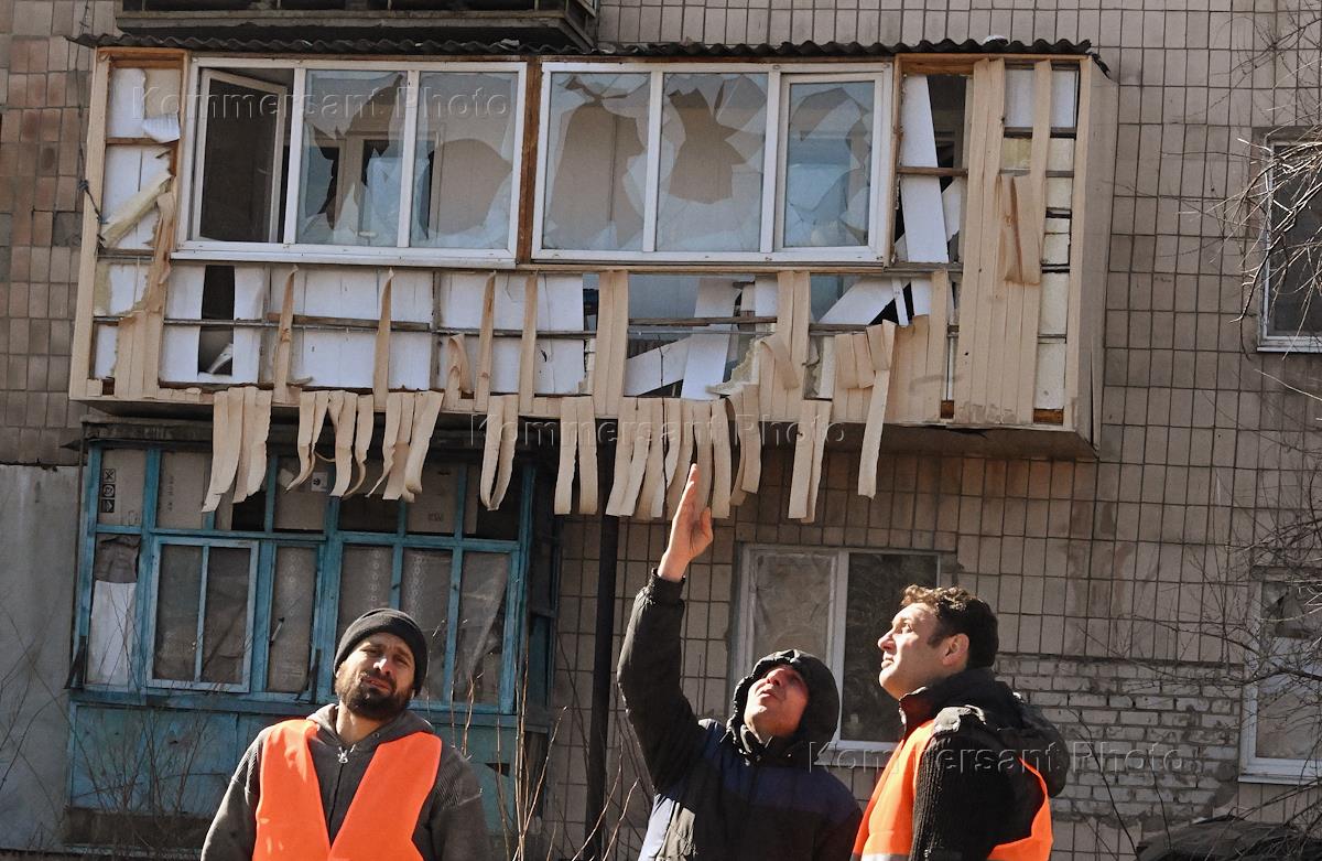 Views of Severodonetsk. Genre photography. Utility workers in front of a residential building damaged by shelling.