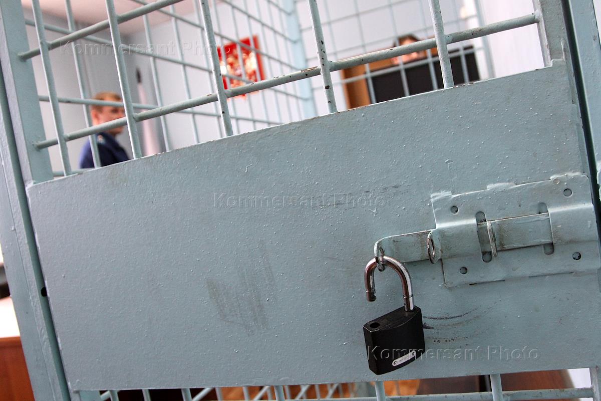 Жанровая фотография. Зал судебных заседаний. Замок на двери металлической клетки для подсудимых.