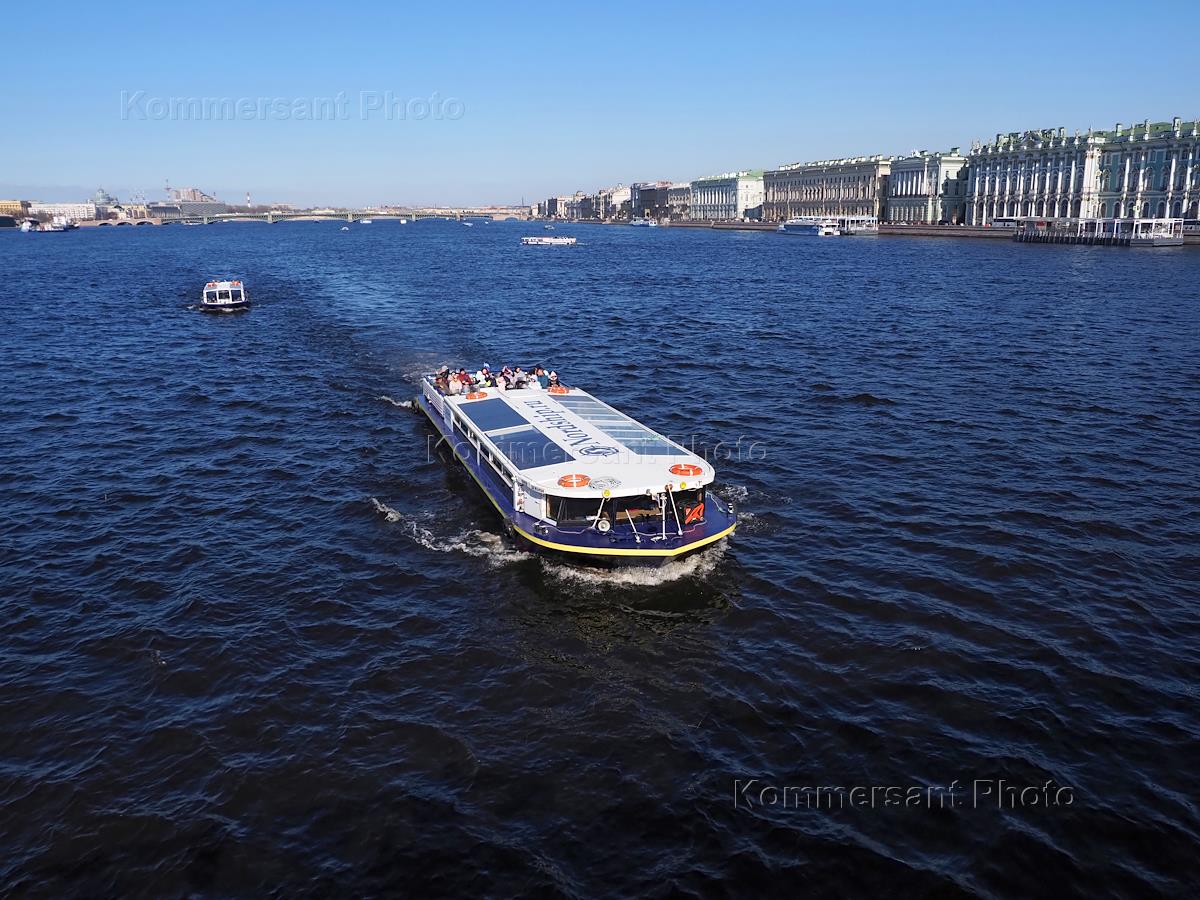 Views of St. Petersburg. Genre photography. River pleasure boat on the Neva River.