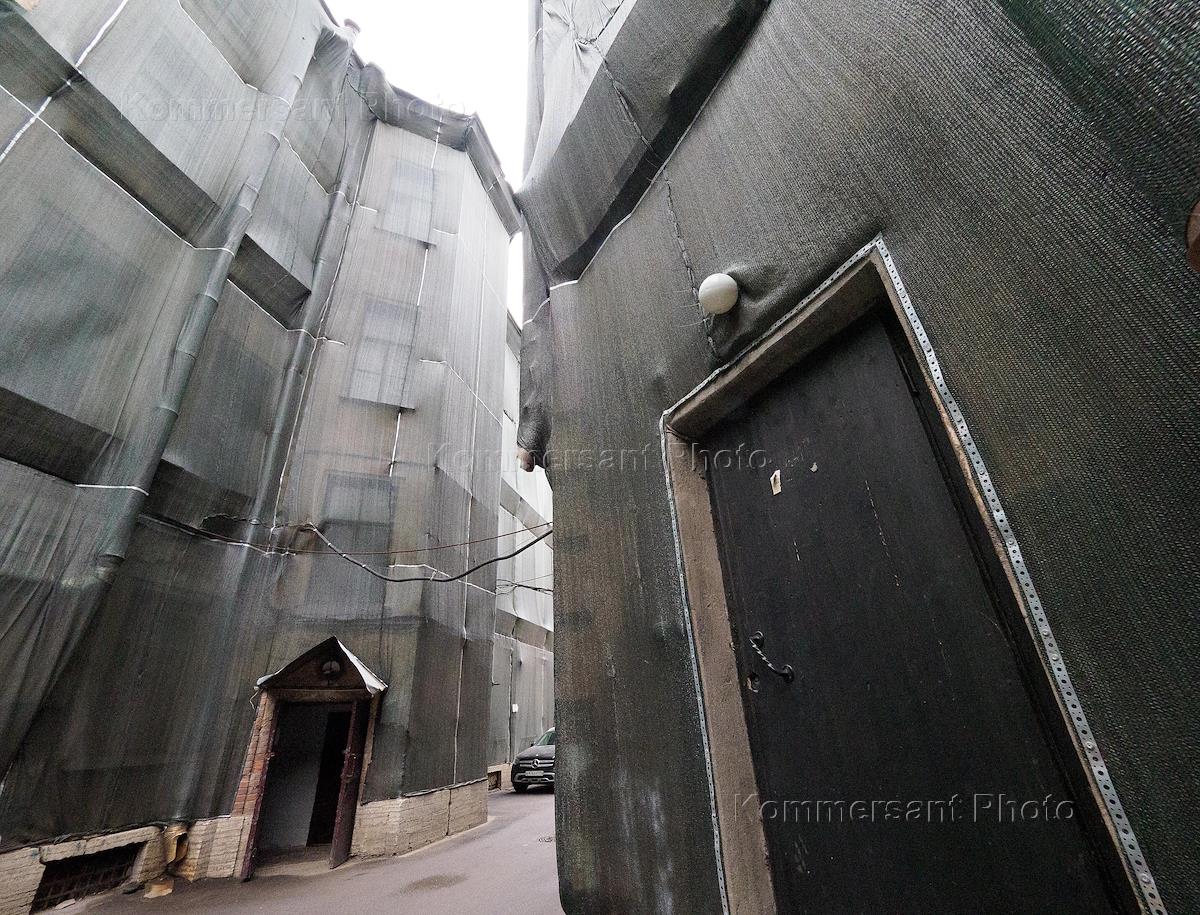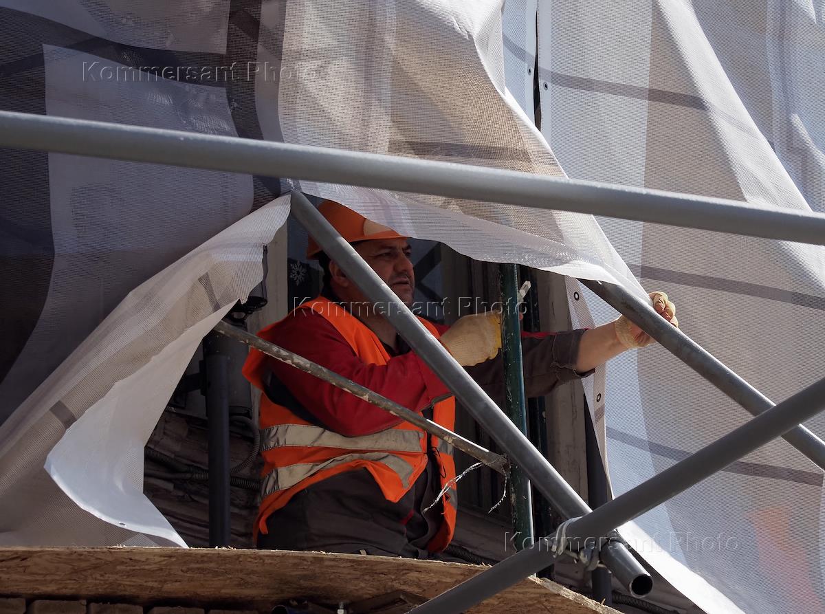Жанровая фотография. Васильевский остров. Реставрационные работы на фасаде зданий, обтянутых защитной сеткой.