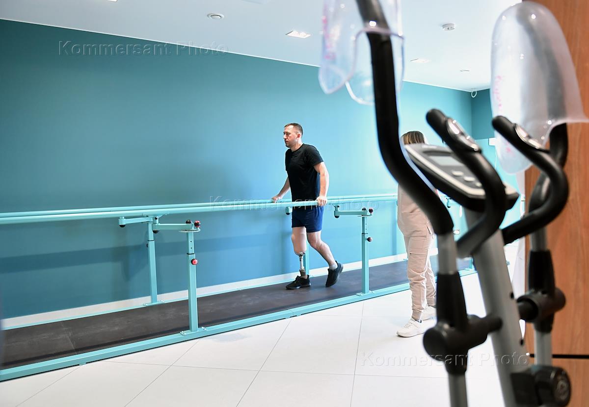 Opening ceremony of the new site of the prosthetic and orthopedic center "Skoliologik.ru" at Vyborgskoye Shosse, 64. Genre photography. Patient on a treadmill in the center.