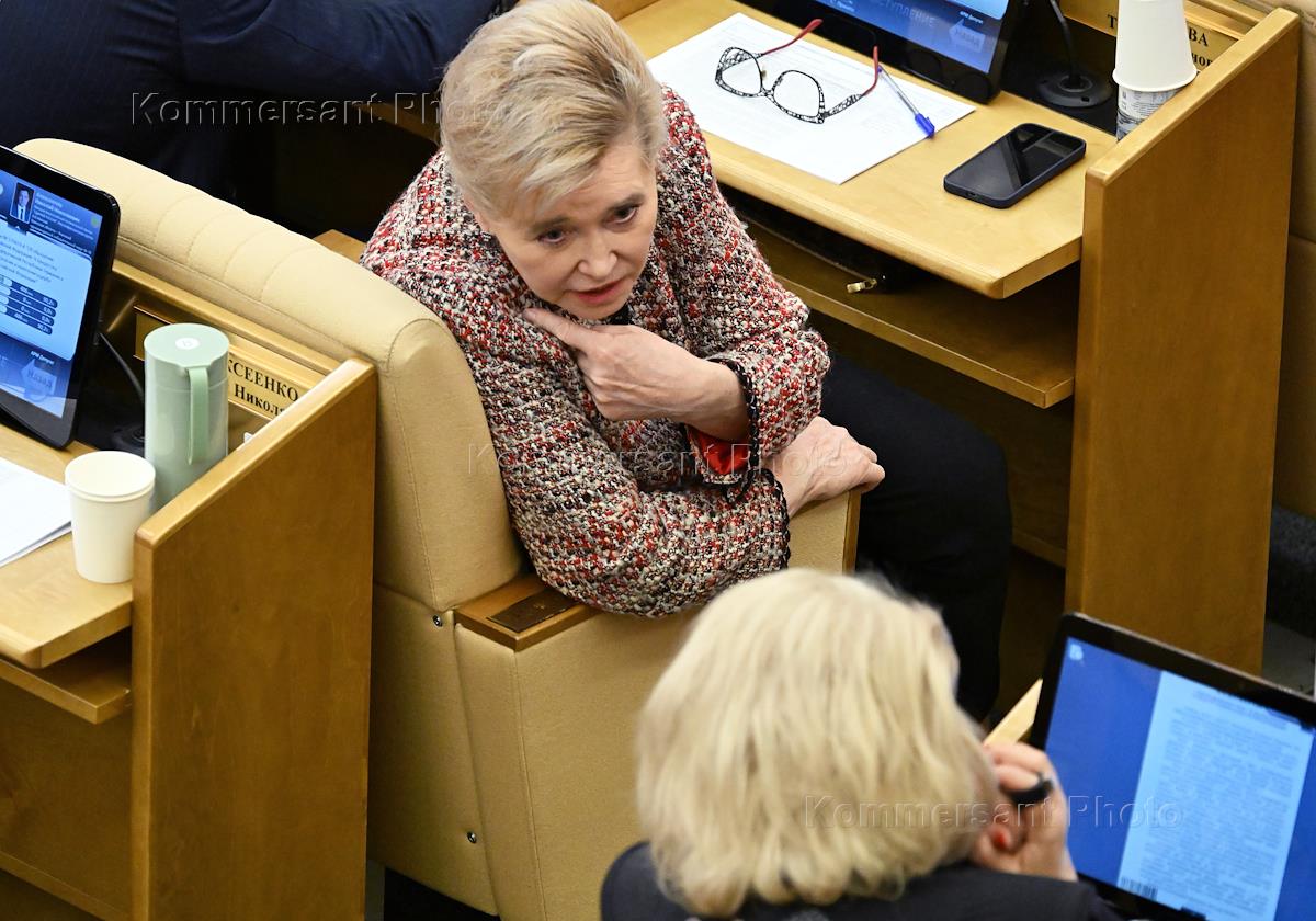 Plenary meeting of the State Duma of Russia. Member of the Russian State Duma Committee on Health Protection Tamara Frolova (left) during the meeting.