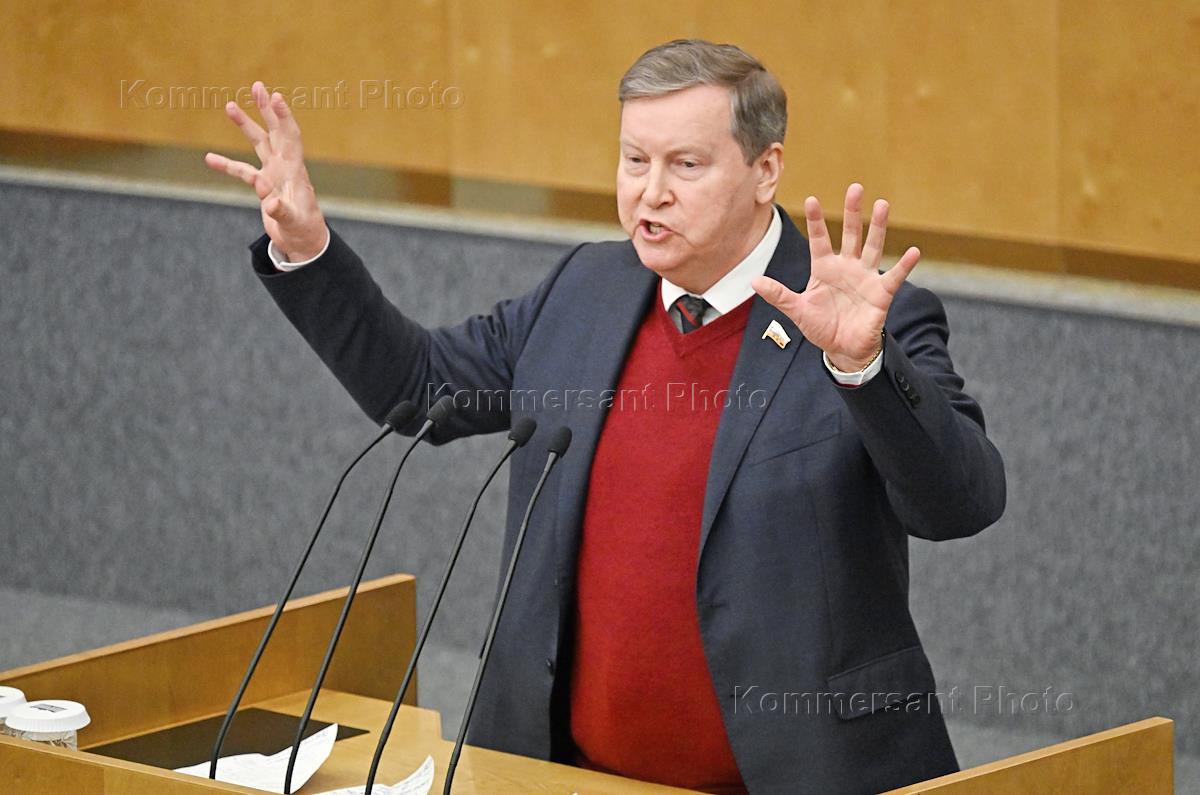 Plenary meeting of the State Duma of Russia. Chairman of the Russian State Duma Committee on Affairs of the Commonwealth of Independent States, Eurasian Integration and Relations with Compatriots Leonid Kalashnikov (right) during the meeting.