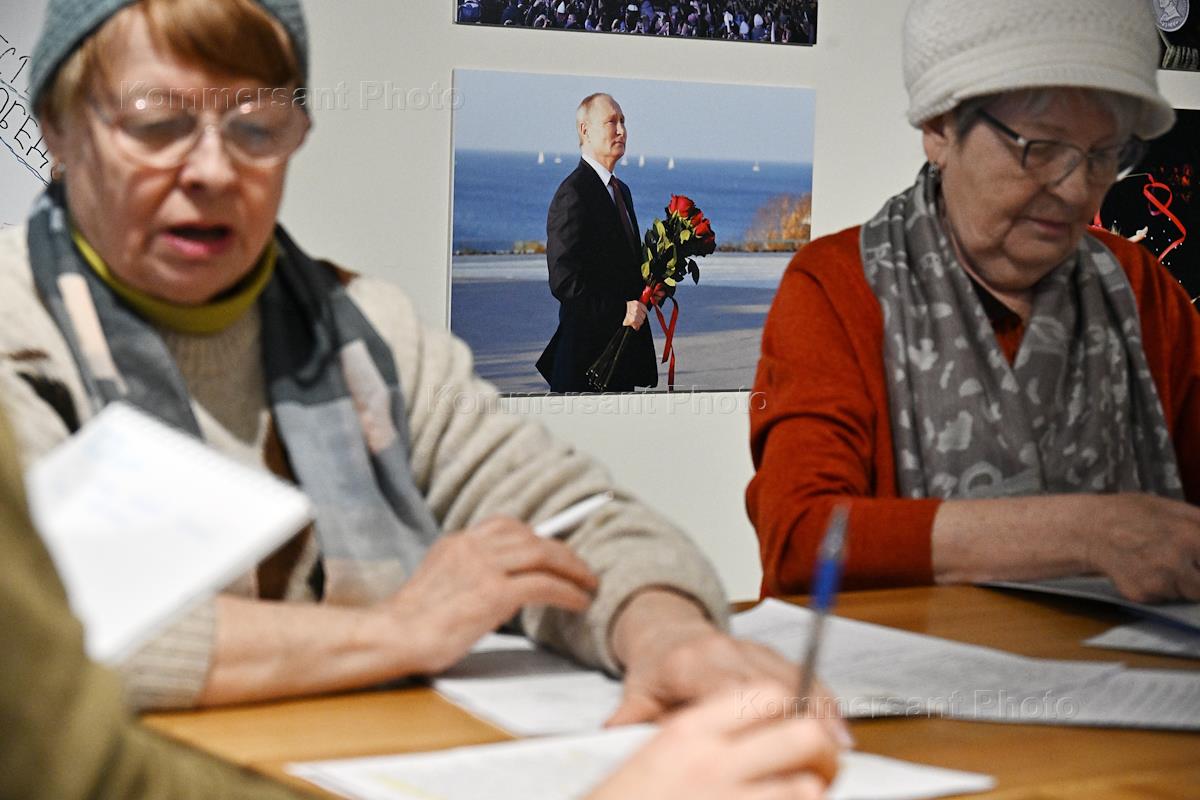The work of the headquarters of Russian presidential candidate and current Russian President Vladimir Putin on Pokrovka Street. Genre photography. Visitors in the Public Reception.