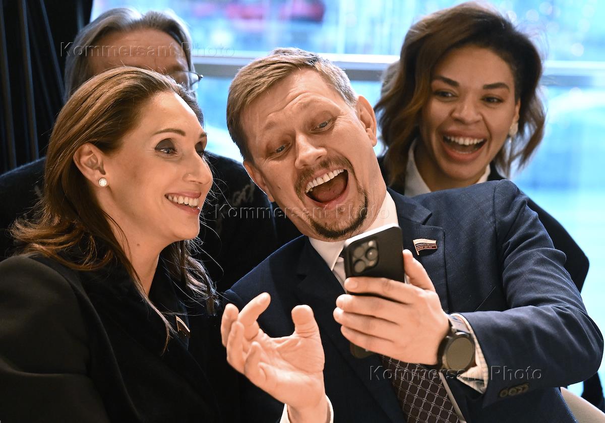 Стендап-прожарка кандидата в президенты России Владислава Даванкова и его предвыборной программы в штабе общественной поддержки. Слева направо: член комитета Государственной думы (ГД) России по международным делам Роза Чемерис, член комитета ГД России по промышленности и торговле Владимир Плякин и заместитель председателя комитета ГД России по государственному строительству и законодательству Сардана Авксентьева перед началом мероприятия.