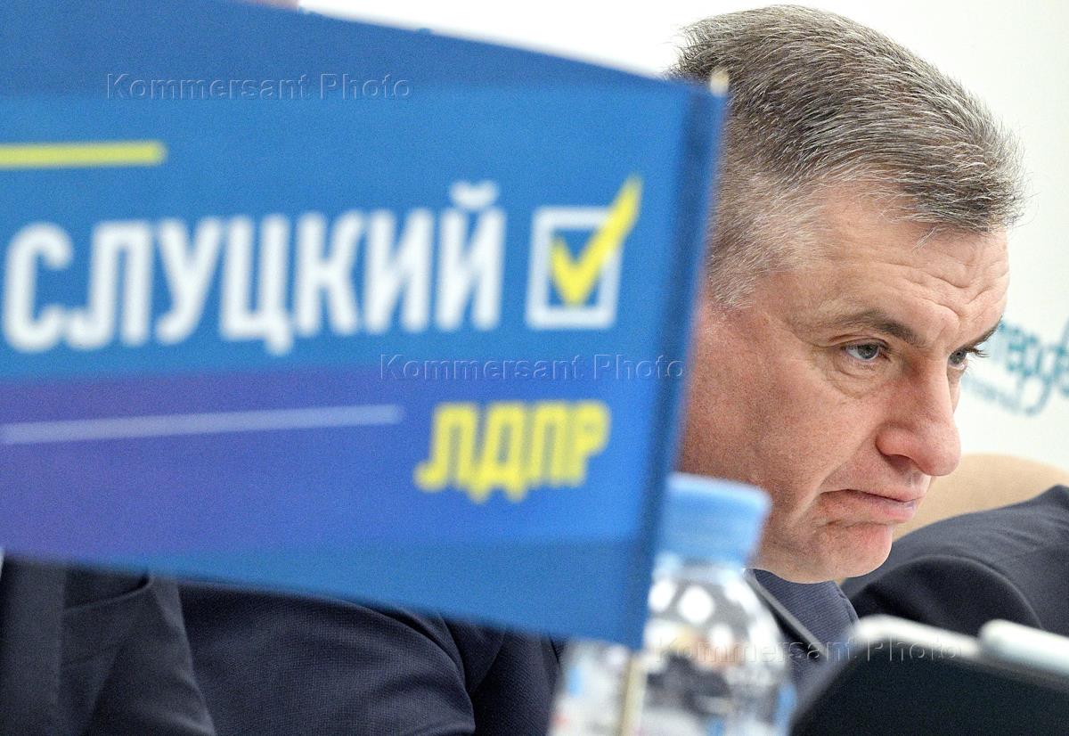 Press conference "On the election campaign of the candidate for the post of President of Russia from the LDPR Leonid Slutsky" at the central office of the Interfax agency. Russian presidential candidate from the Liberal Democratic Party of Russia (LDPR), chairman of the LDPR, head of the LDPR faction in the State Duma of Russia Leonid Slutsky during the press conference.