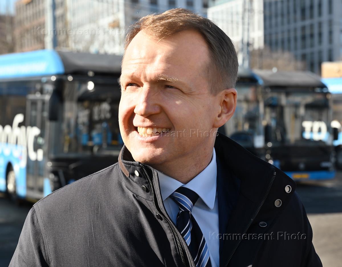 Presentation of the LiAZ electric bus, a new delivery from the Likinsky Bus Plant in an updated design, at the North-Eastern branch of the State Unitary Enterprise "Mosgortrans". CEO of State Unitary Enterprise Mosgortrans Nikolai Asaul during the presentation.