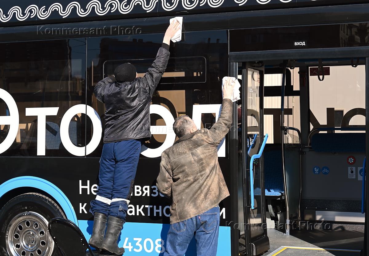 Presentation of the LiAZ electric bus, a new delivery from the Likinsky Bus Plant in an updated design, at the North-Eastern branch of the State Unitary Enterprise "Mosgortrans". Genre photography. Preparation of the LiAZ electric bus.