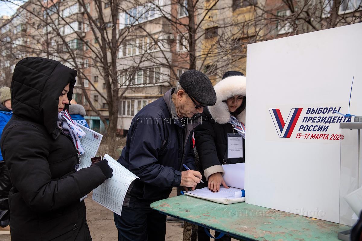 Russian presidential elections in the Donetsk People's Republic (DPR). Early voting in Donetsk. Genre photography. People voting at a mobile polling station on the street.