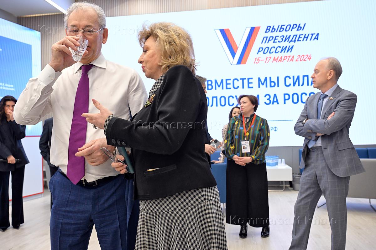 Церемония открытия Информационного центра Центральной избирательной комиссии (ЦИК) России на выборах президента России. Процедура разделения ключей дистанционного электронного голосования. Член ЦИК России Николай Левичев (слева) и уполномоченный по правам человека в России Татьяна Москалькова (в центре) во время церемонии.