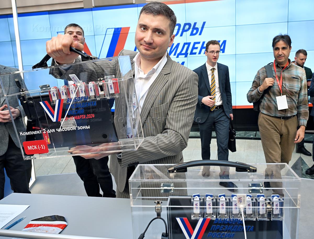 Церемония открытия Информационного центра Центральной избирательной комиссии (ЦИК) России на выборах президента России. Процедура разделения ключей дистанционного электронного голосования.