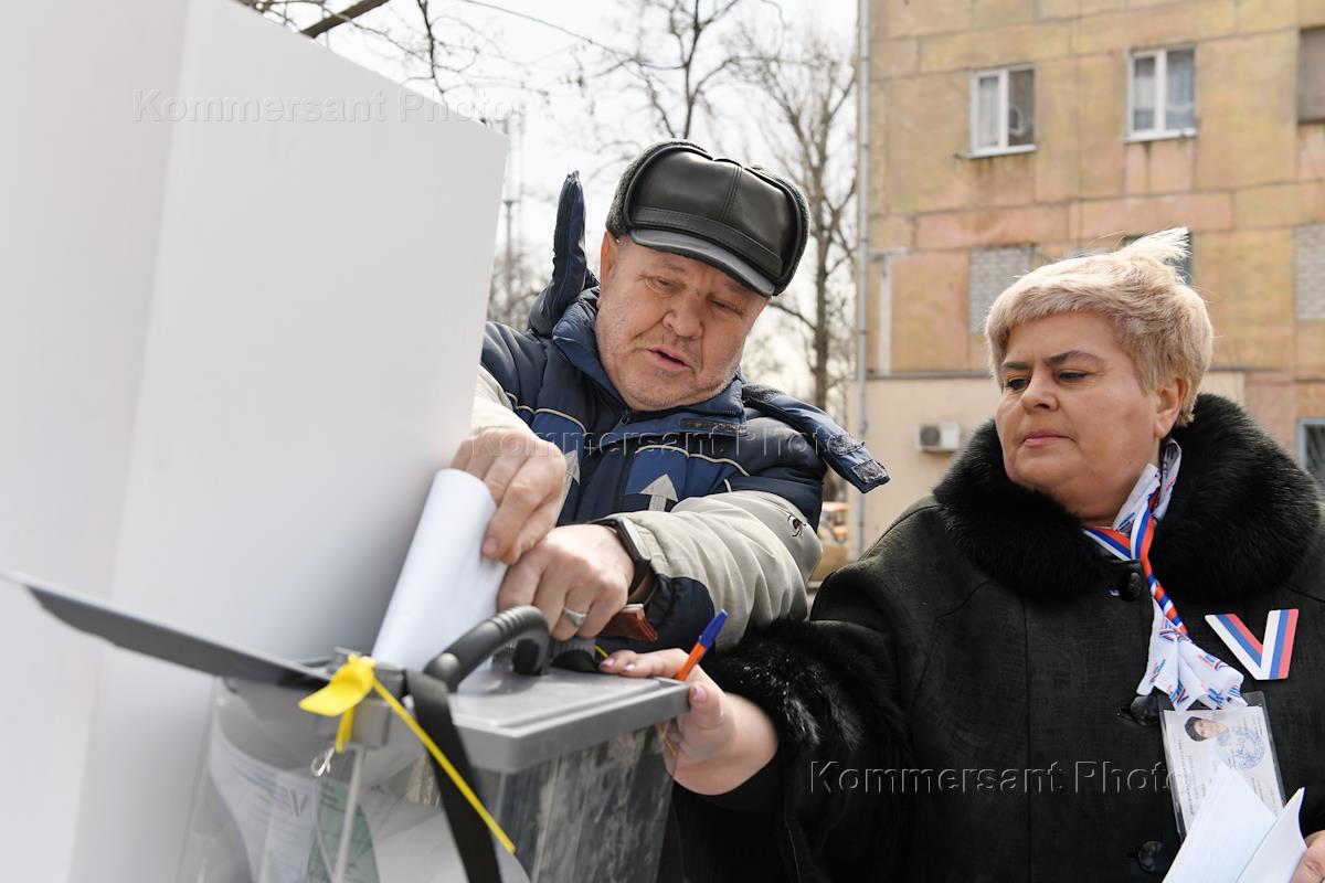 Выборы президента России в Донецкой народной республике (ДНР). Досрочное голосование в Мариуполе. Мобильный избирательный пункт на улице города. Избиратели во время голосования.