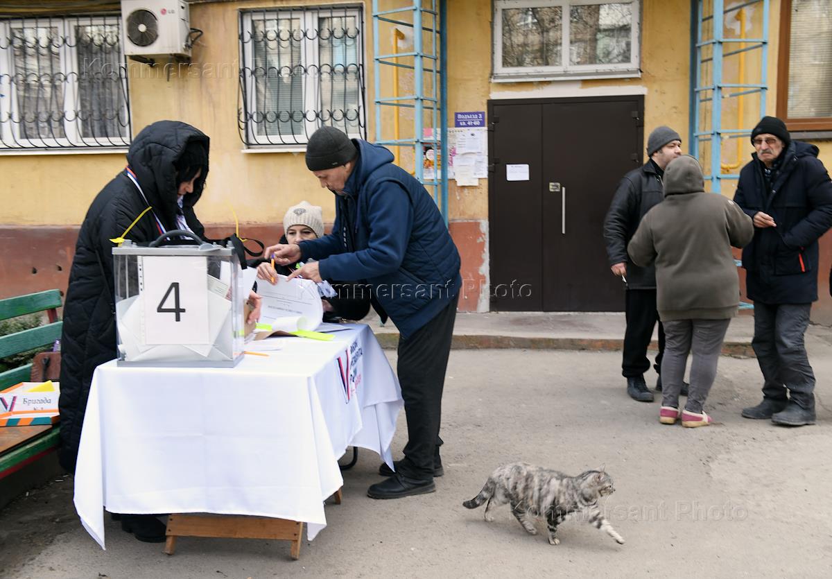 Russian presidential elections in the Donetsk People's Republic (DPR). Early voting in Mariupol. Mobile voting point on a city street.