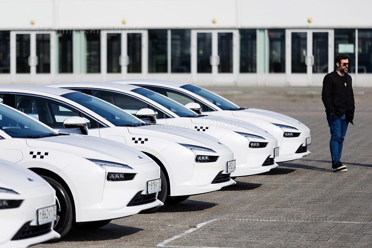 Presentation of the electric vehicle "Yandex taxi", based on the electric vehicle of the Kaliningrad automobile plant "Avtotor" - "Amberauto". Electric cars in the parking lot.