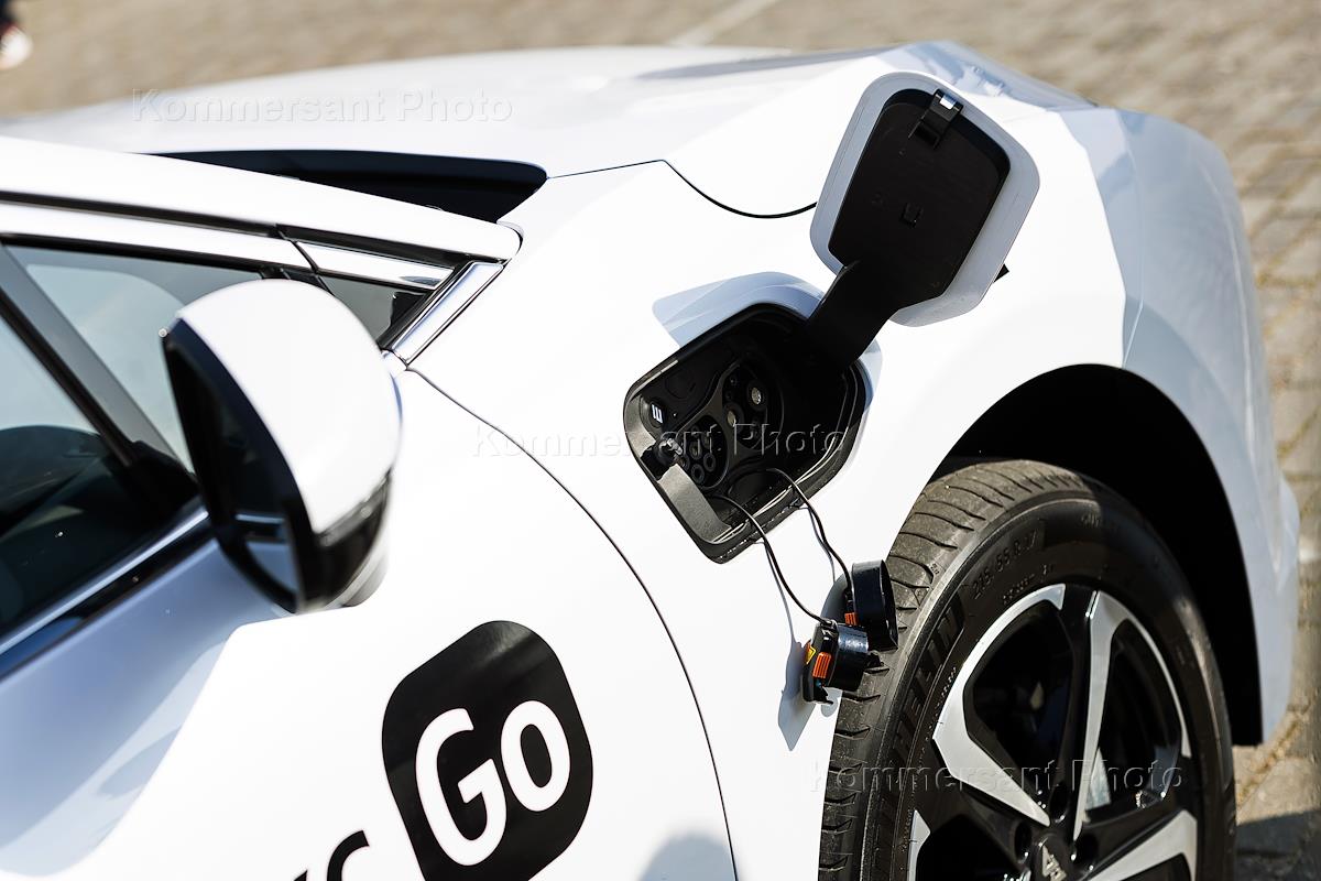 Презентация электромобиля "Яндекс такси", на базе электромобиля калининградском автомобильном заводе "Автотор" - "Амберавто". Жанровая фотография. Люк для подзарядки электромобиля.