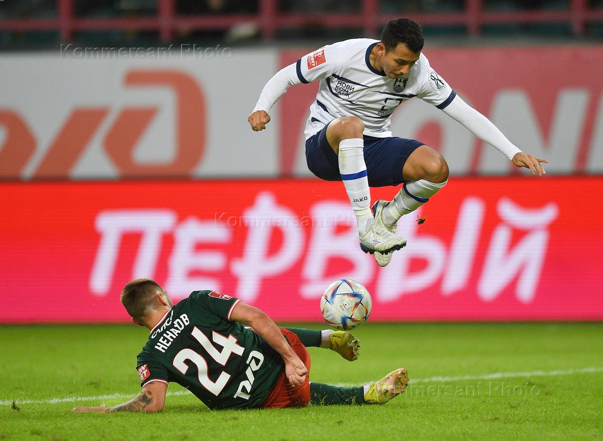 FONBET - Кубок России по футболу. 1/4 финала. Матч между командами "Локомотив" (Москва) - "Балтика" (Калининград) на стадионе "РЖД Арена". Игрок команды "Балтика" Роберто Фернандес (справа) и игрок команды "Локомотив" Максим Ненахов (слева) во время матча.