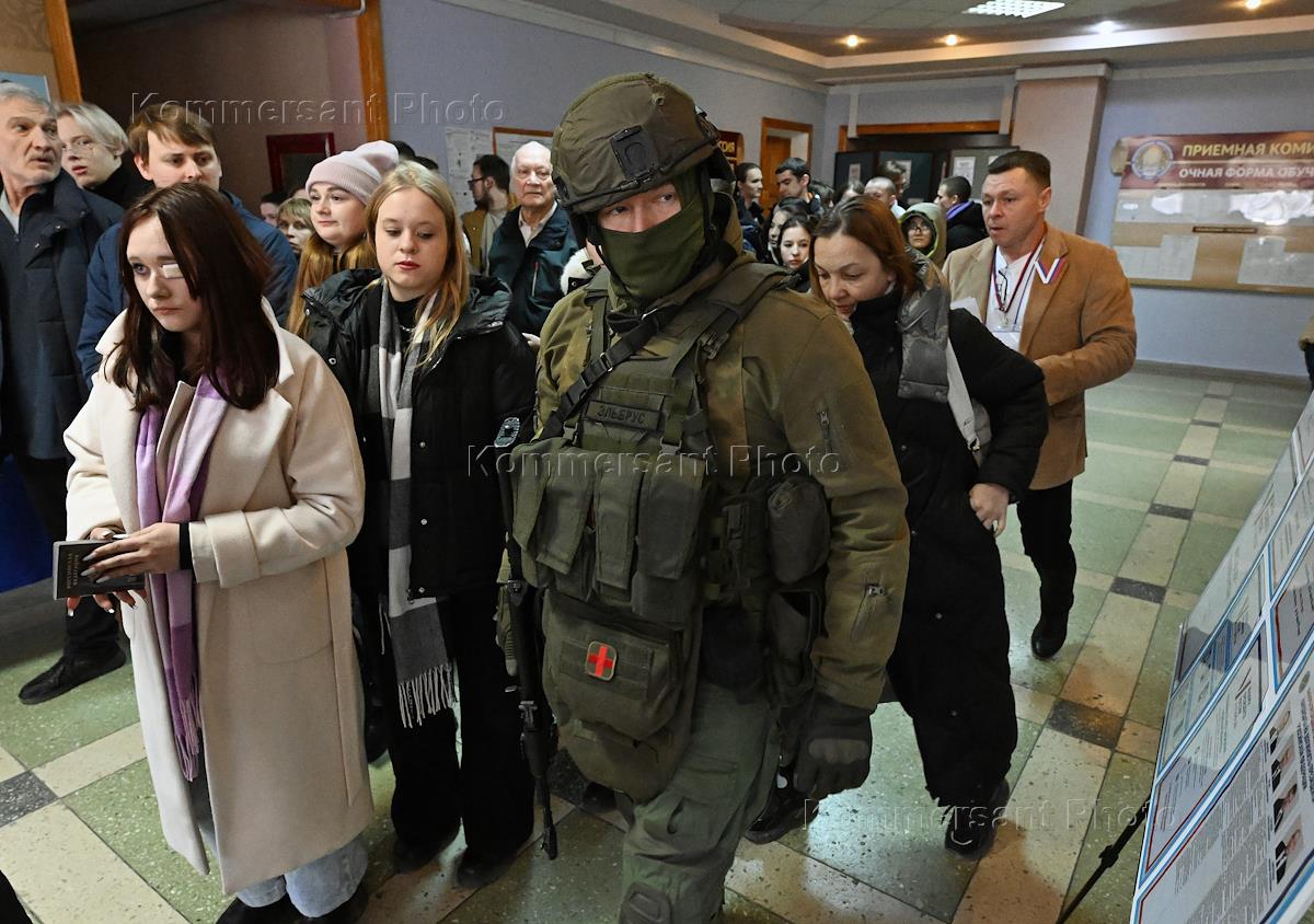 Russian presidential elections in the Lugansk People's Republic (LPR). Voters at the entrance to the polling station.
