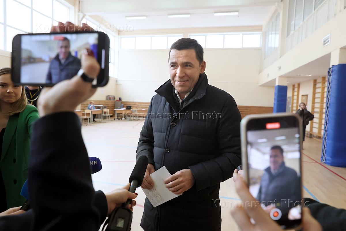 Russian presidential elections. Governor of the Sverdlovsk Region Evgeny Kuyvashev during voting at a polling station.