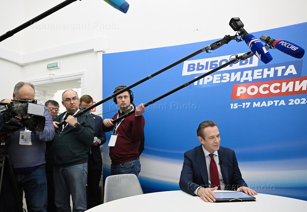 Russian presidential elections. Meeting with international observers of the Shanghai Cooperation Organization (SCO) at the central election headquarters of Russian presidential candidate and current Russian President Vladimir Putin in Gostiny Dvor. Co-chairman of the election headquarters of Russian presidential candidate Vladimir Putin, chairman of the Union of Theater Workers of Russia, artistic director of the Moscow Oleg Tabakov Theater Vladimir Mashkov during the meeting.