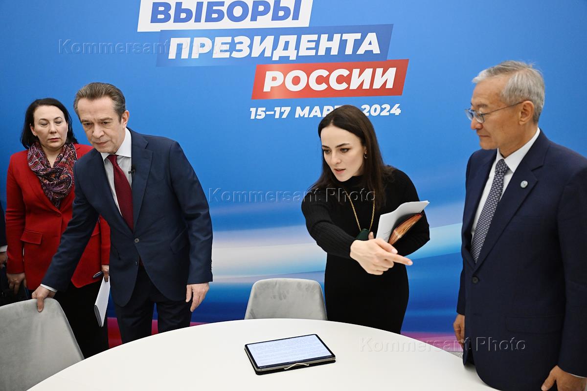 Russian presidential elections. Meeting with international observers of the CSTO PA at the central election headquarters of Russian presidential candidate and current Russian President Vladimir Putin in Gostiny Dvor. From left to right: observer of the CSTO PA, deputy chairman of the Jogorku Kenesh Committee of the Kyrgyz Republic on law and order, combating crime and anti-corruption Alisher Erbaev, co-chairman of the election headquarters of the candidate for the post of President of Russia Vladimir Putin, chairman of the Union of Theater Workers of Russia, artistic director of the Moscow Oleg Tabakov Theater Vladimir Mashkov and Deputy Dean of the Faculty of Law, Manager of the Institute for Research of National and Comparative Law of the National Research University Higher School of Economics (HSE), staff lawyer Albina Gadzhieva during the meeting.